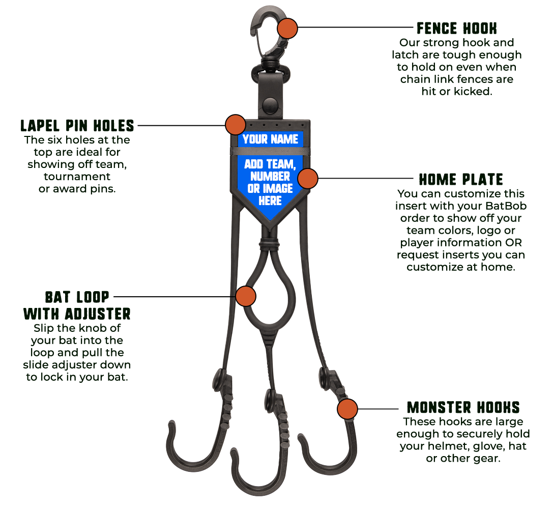 BatBob makes it easy for baseball and softball teams to organize bats, gloves and helmets on the dugout fence. Your gear stays off the ground (so it doesn’t get dinged up) and your players stay on top of their game.