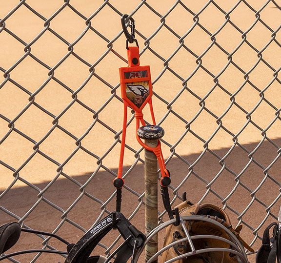 BatBob utilizes a durable bungee loop with a slide adjuster to cinch around the knob of the bat. If the bat is hit by a baseball while being held by the BatBob, it will not fall off the fence. Usually, players like to keep the loop fairly loose so they can just grab their bat easily, so experience will help decide how tight you want to cinch the BatBob around your bat.
